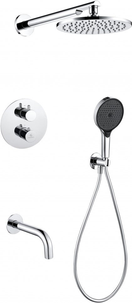 Смеситель, термостатический картридж, переключатели режимов и потоков, тропическая верхняя лейка, крепление верхней лейки, ручная лейка, держатель для ручной лейки, шланг для ручной лейки, эксцентрики, отражатели, прокладки, монтажный комплект