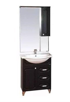 Вместительная тумба с 3 ящиками и отделением с распашной створкой задает общий стиль комплекта мебели Misty Александра 65 R венге, который подойдет для небольших ванных комнат. Особенно органично модель впишется в интерьер ретро-тематики, благодаря объемной фрезеровке и необычным ручкам с эмалевыми вставками. Тумба дополнена фаянсовой раковиной и большим настенным зеркалом с компактным правосторонним шкафчиком.